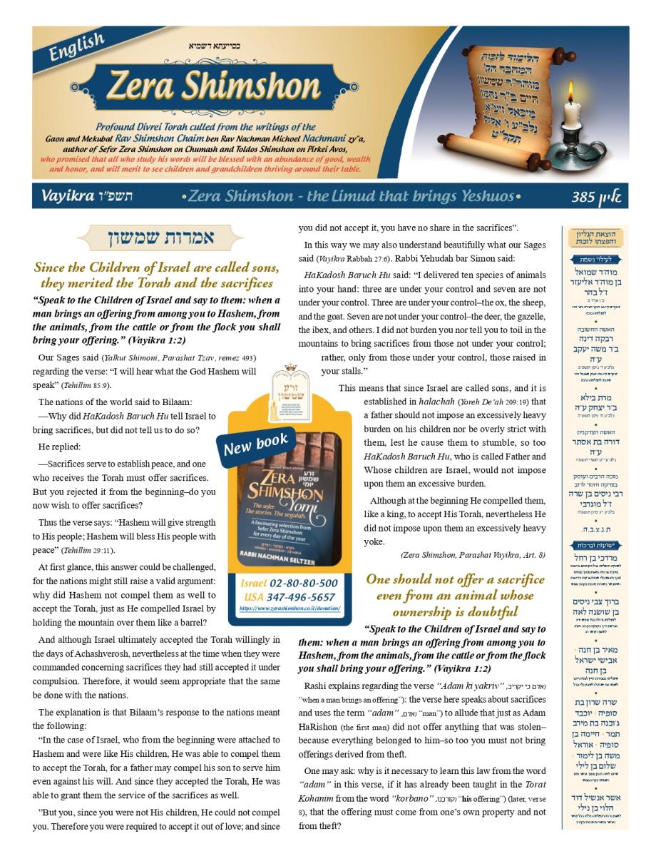 Zera Shimshon - Rabbi Shimshon Chaim ben Rabbi Nachman Michal Nachmani, was a Rabbi of four large communities throughout Italy and in his end of life in the city Reggio Emilia. Rabbi Shimshon Chaim 'Niftar' in the year 1779 in the city Reggio in Itlay. During his funeral, there were many words of praise, not just in his erudition of Torah, but on his love for the Jewish people. The communities in Italy and abroad considered Rabbi Shimshon Chaim their Rebby. Major Rabbis in his generation, wrote amazing things in his honor and wisdom. Including One of the outstanding rabbis figures the 'Hida' (Rabbi Haim Yosef David Azulai ben Rabbi Rephael Yitzhak Zerachia) had testify on Rabbi Shimshon Chaim praise in 'Kedushah' and wisdom and also knowledge in studying 'Kabala' and practical 'Kabala'. Rabbi Shimshon Chaim lived in 'Or ha-Ḥayyim' 'Hakadosh' (Rabbi Chaim ben Atar ben Rabbi Moshe) era, and was in friendship with him. Rabbi Shimshon Chaim had only one child, a son, who died at a young age. Upon this Rabbi Shimshon Chaim decided to dedicate his 'Sefarim' to the memory of this child who had no continuity of a family. In the beginning of his book Rabbi Shimshon Chaim wrote that he need to leave some memory in this world because he has no continuity. And that’s why he wrote the book and named it: "Zera Shimshon", means the Seed of Shimshon. Rabbi Shimshon Chaim publish the book one year before he died. Rabbi Shimshon Chaim placed a lot of his energy, during his lifetime that people should learn from his ''Sefarim''. Rabbi Shimshon Chaim also emphasized, that after his 'Neshama', will leave this world that people should continue to learn from his ''Sefarim''. What is most unusual for a Tzadik of this stature, was that he made a promise. That promise is that anyone that takes upon himself to learn from his writing, he promises "children, praise, health, 'Parnasa', wealth, honor".