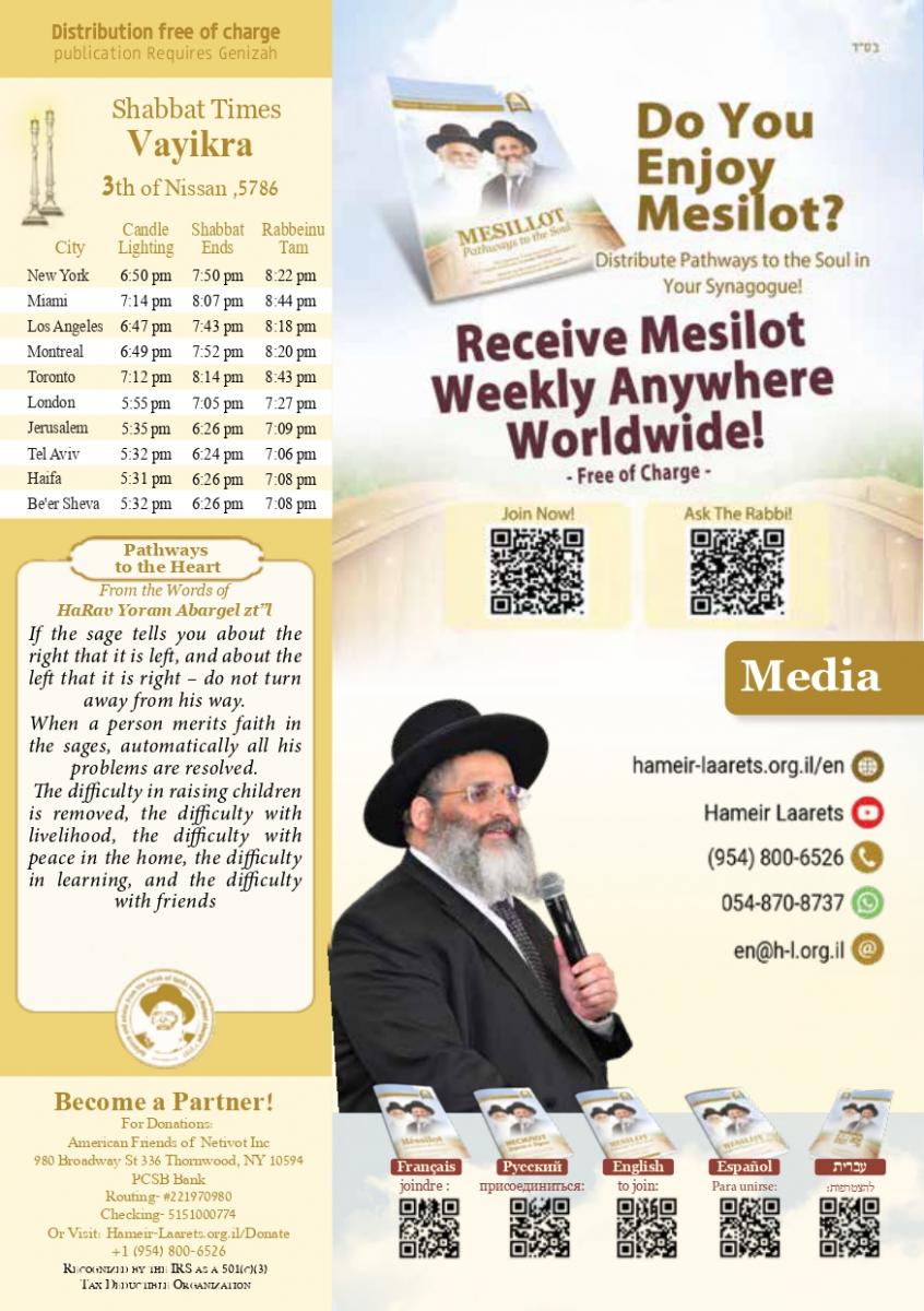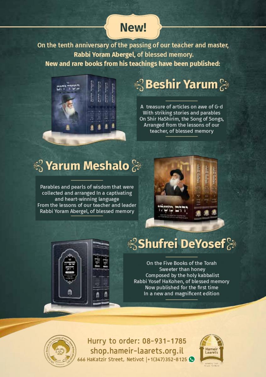 Rabbi Israel Abargel and Hameir Laarets work to spread Torah in Israel and around the world. Their activities include classes, lectures, and daily support and assistance to those in need. Hameir Laarets is a Torah Institute that deals with the publication and distribution of the works and teachings of Rabbi Yoram Michael Abargel zt”l. Hameir Laarets has already released over 50 books and more than 100,000 copies of our publication “Mesillot” are distributed free of charge every week. Our organization also provides daily support and assistance to those in need. Rabbi Yoram Michael Abergel, OB”M was the founder and head of Torah and Hessed institutions called Kol Rina Rav Phelim and Rav Phelim whose center is currently in Netivot . Over 4,000 Avrach scholars study in these institutions. He is the author of: - Bezur Yarom - his lessons on Sefer HaTanya, - Amri Noam - his lessons on the Parshiyot of the week and the festivals of Israel - Kol Rina - prayer arrangement and cycle series