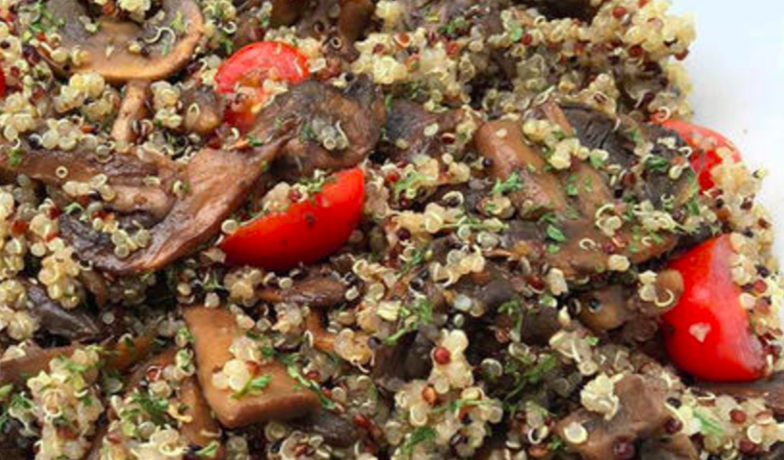 In a big bowl, add the quinoa, cherry tomatoes, sunflower seeds, fresh parsley, and the balsamic mushrooms.