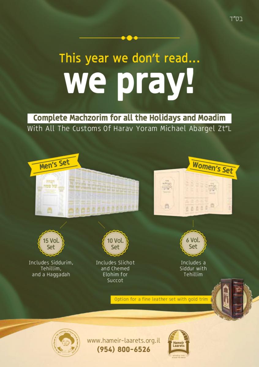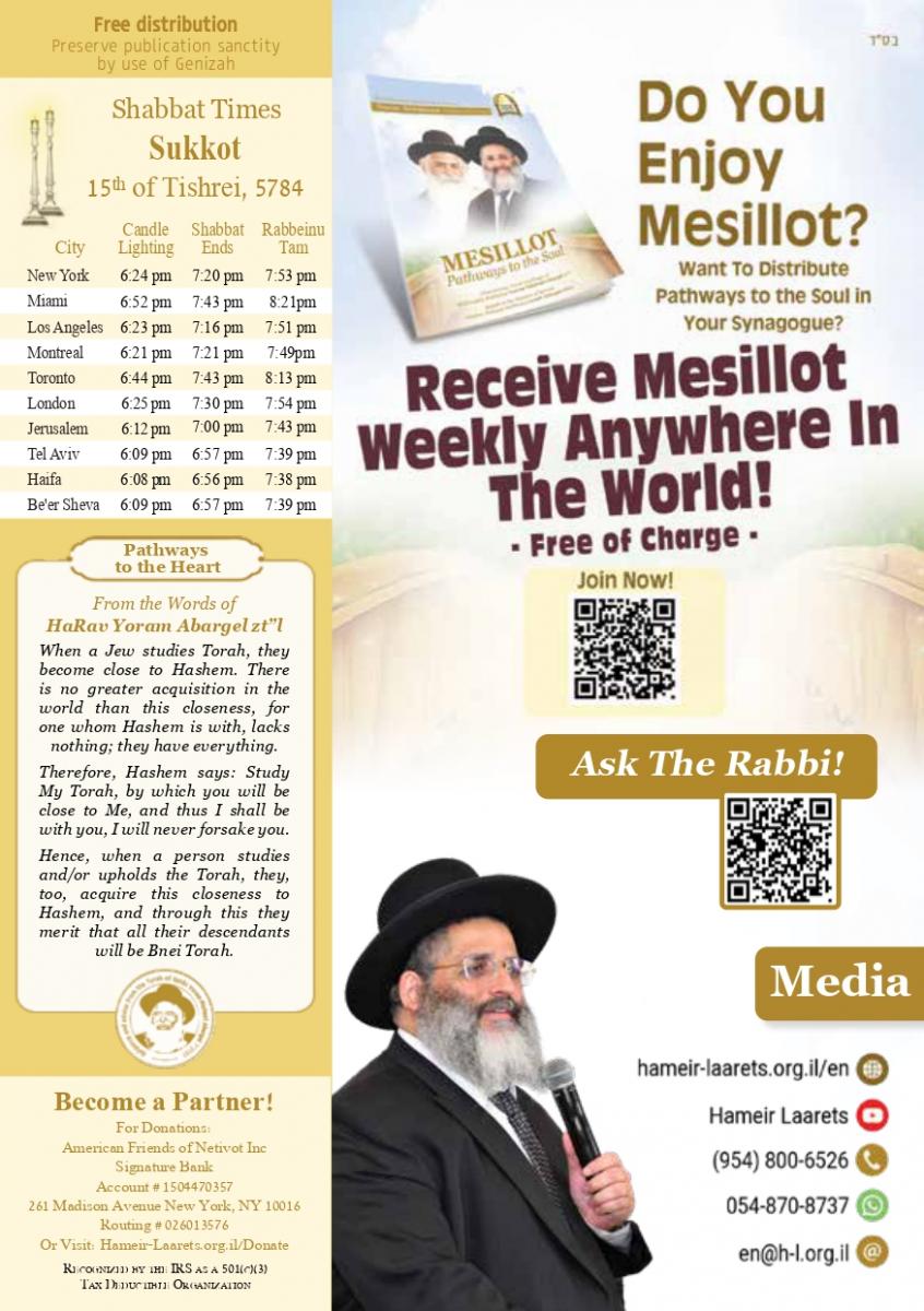 Rabbi Israel Abargel and Hameir Laarets work to spread Torah in Israel and around the world. Their activities include classes, lectures, and daily support and assistance to those in need. Hameir Laarets is a Torah Institute that deals with the publication and distribution of the works and teachings of Rabbi Yoram Michael Abargel zt”l. Hameir Laarets has already released over 50 books and more than 100,000 copies of our publication “Mesillot” are distributed free of charge every week. Our organization also provides daily support and assistance to those in need. Rabbi Yoram Michael Abergel, OB”M was the founder and head of Torah and Hessed institutions called Kol Rina Rav Phelim and Rav Phelim whose center is currently in Netivot . Over 4,000 Avrach scholars study in these institutions. He is the author of: - Bezur Yarom - his lessons on Sefer HaTanya, - Amri Noam - his lessons on the Parshiyot of the week and the festivals of Israel - Kol Rina - prayer arrangement and cycle series
