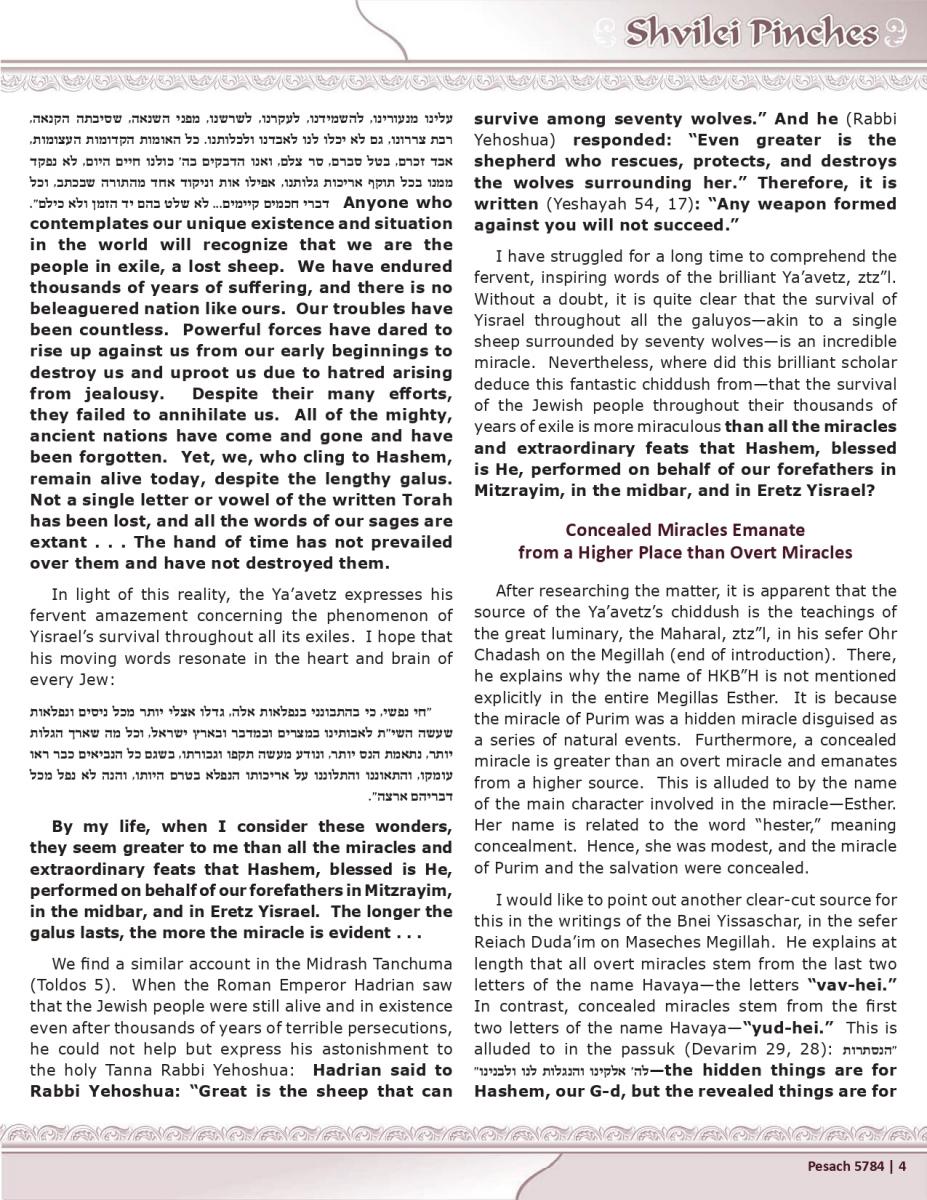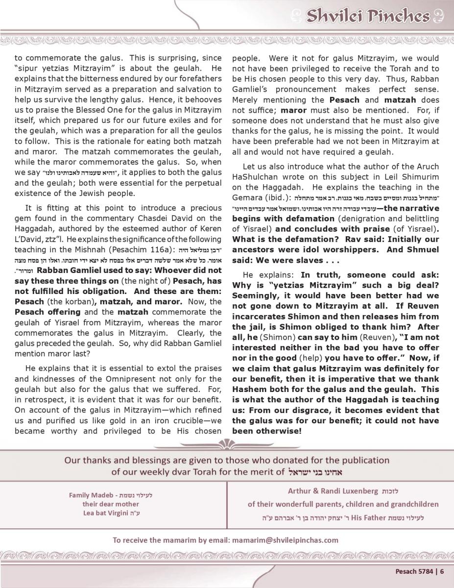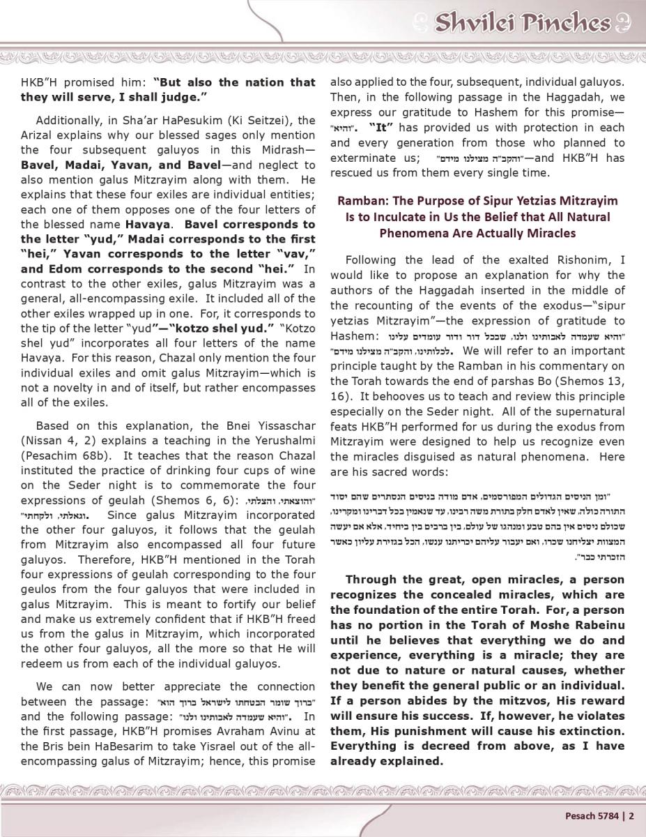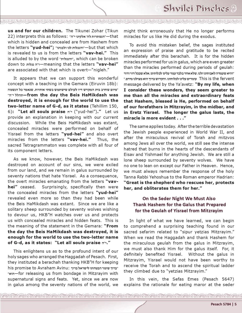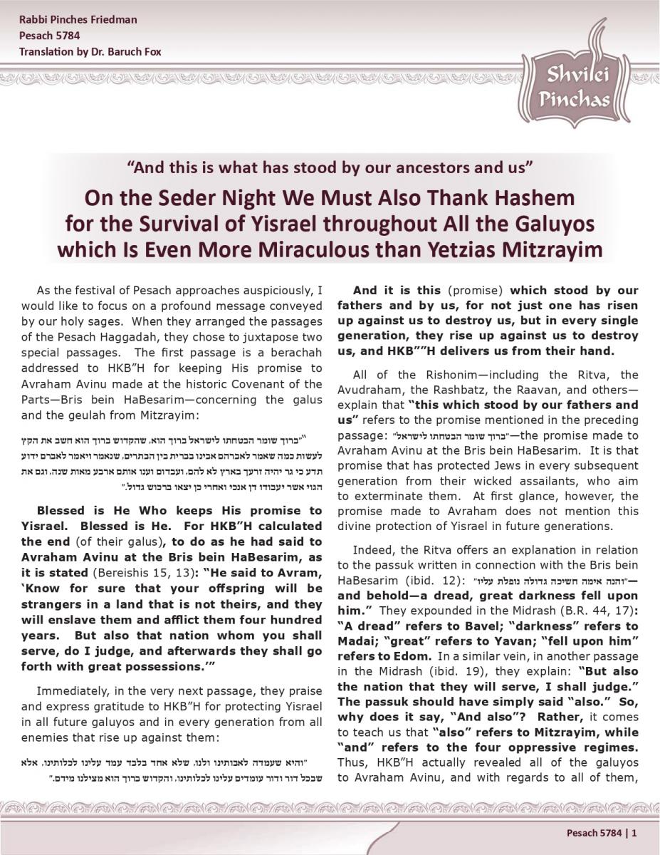 On the Seder Night We Must Also Thank Hashem for the Survival of Yisrael throughout All the Galuyos which Is Even More Miraculous than Yetzias Mitzrayim
