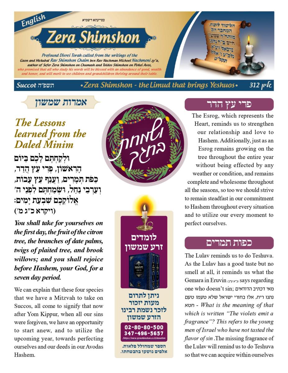Zera Shimshon - Rabbi Shimshon Chaim ben Rabbi Nachman Michal Nachmani, was a Rabbi of four large communities throughout Italy and in his end of life in the city Reggio Emilia. Rabbi Shimshon Chaim 'Niftar' in the year 1779 in the city Reggio in Itlay. During his funeral, there were many words of praise, not just in his erudition of Torah, but on his love for the Jewish people. The communities in Italy and abroad considered Rabbi Shimshon Chaim their Rebby. Major Rabbis in his generation, wrote amazing things in his honor and wisdom. Including One of the outstanding rabbis figures the 'Hida' (Rabbi Haim Yosef David Azulai ben Rabbi Rephael Yitzhak Zerachia) had testify on Rabbi Shimshon Chaim praise in 'Kedushah' and wisdom and also knowledge in studying 'Kabala' and practical 'Kabala'. Rabbi Shimshon Chaim lived in 'Or ha-Ḥayyim' 'Hakadosh' (Rabbi Chaim ben Atar ben Rabbi Moshe) era, and was in friendship with him. Rabbi Shimshon Chaim had only one child, a son, who died at a young age. Upon this Rabbi Shimshon Chaim decided to dedicate his 'Sefarim' to the memory of this child who had no continuity of a family. In the beginning of his book Rabbi Shimshon Chaim wrote that he need to leave some memory in this world because he has no continuity. And that’s why he wrote the book and named it: "Zera Shimshon", means the Seed of Shimshon. Rabbi Shimshon Chaim publish the book one year before he died. Rabbi Shimshon Chaim placed a lot of his energy, during his lifetime that people should learn from his ''Sefarim''. Rabbi Shimshon Chaim also emphasized, that after his 'Neshama', will leave this world that people should continue to learn from his ''Sefarim''. What is most unusual for a Tzadik of this stature, was that he made a promise. That promise is that anyone that takes upon himself to learn from his writing, he promises "children, praise, health, 'Parnasa', wealth, honor".