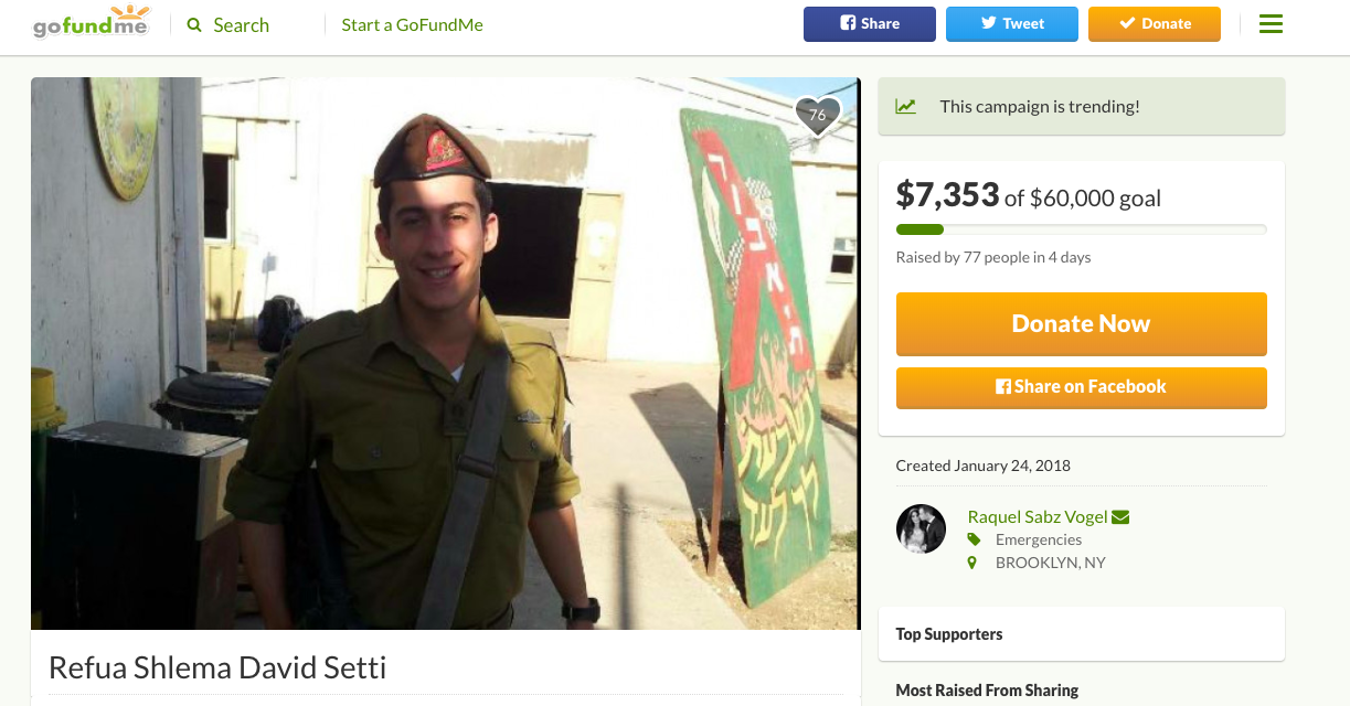 “Refua shelema, brother. You’re stronger than anything out there and with Hashem's help you’ll survive it all,” wrote Ziko Bukai who donated $200 to the cause.