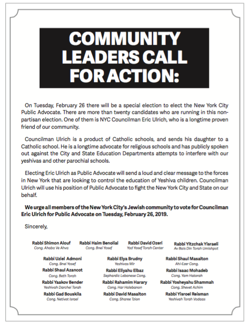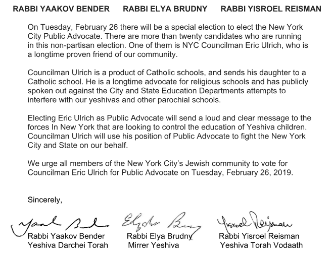 Rabbanim from across the entire spectrum of New York’s Frum community unites in this message to New York residents: Please vote in this TODAYS’s special election for NYC Public Advocate Eric Ulrich.
