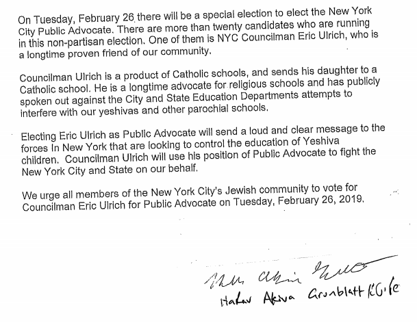 A letter signed by Rabbi Grunblatt endorsing Ulrich.