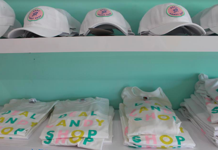 Rows of glass jars filled with sugary sweets line the store. Customers simply grab a bag or bucket, fill it with whatever they desire, and pay by the pound. The Deal Candy Shop also has tote bags, hats, and t-shirts for sale featuring their colorful logo. They will soon be releasing sweatshirts and children's clothing as well.