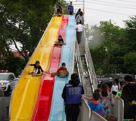 Children enjoying the large slide set up at the Shomrim carnival event.