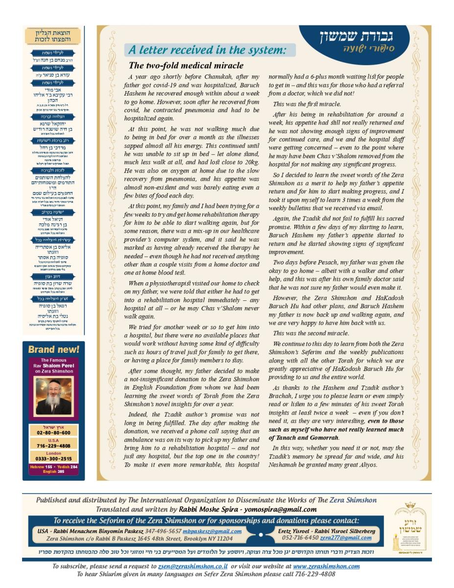 Zera Shimshon - Rabbi Shimshon Chaim ben Rabbi Nachman Michal Nachmani, was a Rabbi of four large communities throughout Italy and in his end of life in the city Reggio Emilia. Rabbi Shimshon Chaim 'Niftar' in the year 1779 in the city Reggio in Itlay. During his funeral, there were many words of praise, not just in his erudition of Torah, but on his love for the Jewish people. The communities in Italy and abroad considered Rabbi Shimshon Chaim their Rebby. Major Rabbis in his generation, wrote amazing things in his honor and wisdom. Including One of the outstanding rabbis figures the 'Hida' (Rabbi Haim Yosef David Azulai ben Rabbi Rephael Yitzhak Zerachia) had testify on Rabbi Shimshon Chaim praise in 'Kedushah' and wisdom and also knowledge in studying 'Kabala' and practical 'Kabala'. Rabbi Shimshon Chaim lived in 'Or ha-Ḥayyim' 'Hakadosh' (Rabbi Chaim ben Atar ben Rabbi Moshe) era, and was in friendship with him. Rabbi Shimshon Chaim had only one child, a son, who died at a young age. Upon this Rabbi Shimshon Chaim decided to dedicate his 'Sefarim' to the memory of this child who had no continuity of a family. In the beginning of his book Rabbi Shimshon Chaim wrote that he need to leave some memory in this world because he has no continuity. And that’s why he wrote the book and named it: "Zera Shimshon", means the Seed of Shimshon. Rabbi Shimshon Chaim publish the book one year before he died. Rabbi Shimshon Chaim placed a lot of his energy, during his lifetime that people should learn from his ''Sefarim''. Rabbi Shimshon Chaim also emphasized, that after his 'Neshama', will leave this world that people should continue to learn from his ''Sefarim''. What is most unusual for a Tzadik of this stature, was that he made a promise. That promise is that anyone that takes upon himself to learn from his writing, he promises "children, praise, health, 'Parnasa', wealth, honor".
