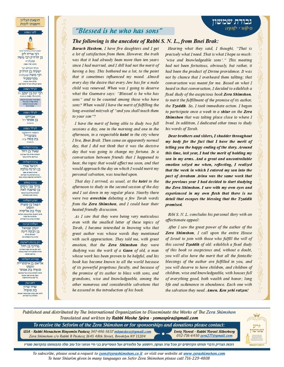 Zera Shimshon - Rabbi Shimshon Chaim ben Rabbi Nachman Michal Nachmani, was a Rabbi of four large communities throughout Italy and in his end of life in the city Reggio Emilia. Rabbi Shimshon Chaim 'Niftar' in the year 1779 in the city Reggio in Itlay. During his funeral, there were many words of praise, not just in his erudition of Torah, but on his love for the Jewish people. The communities in Italy and abroad considered Rabbi Shimshon Chaim their Rebby. Major Rabbis in his generation, wrote amazing things in his honor and wisdom. Including One of the outstanding rabbis figures the 'Hida' (Rabbi Haim Yosef David Azulai ben Rabbi Rephael Yitzhak Zerachia) had testify on Rabbi Shimshon Chaim praise in 'Kedushah' and wisdom and also knowledge in studying 'Kabala' and practical 'Kabala'. Rabbi Shimshon Chaim lived in 'Or ha-Ḥayyim' 'Hakadosh' (Rabbi Chaim ben Atar ben Rabbi Moshe) era, and was in friendship with him. Rabbi Shimshon Chaim had only one child, a son, who died at a young age. Upon this Rabbi Shimshon Chaim decided to dedicate his 'Sefarim' to the memory of this child who had no continuity of a family. In the beginning of his book Rabbi Shimshon Chaim wrote that he need to leave some memory in this world because he has no continuity. And that’s why he wrote the book and named it: "Zera Shimshon", means the Seed of Shimshon. Rabbi Shimshon Chaim publish the book one year before he died. Rabbi Shimshon Chaim placed a lot of his energy, during his lifetime that people should learn from his ''Sefarim''. Rabbi Shimshon Chaim also emphasized, that after his 'Neshama', will leave this world that people should continue to learn from his ''Sefarim''. What is most unusual for a Tzadik of this stature, was that he made a promise. That promise is that anyone that takes upon himself to learn from his writing, he promises "children, praise, health, 'Parnasa', wealth, honor".