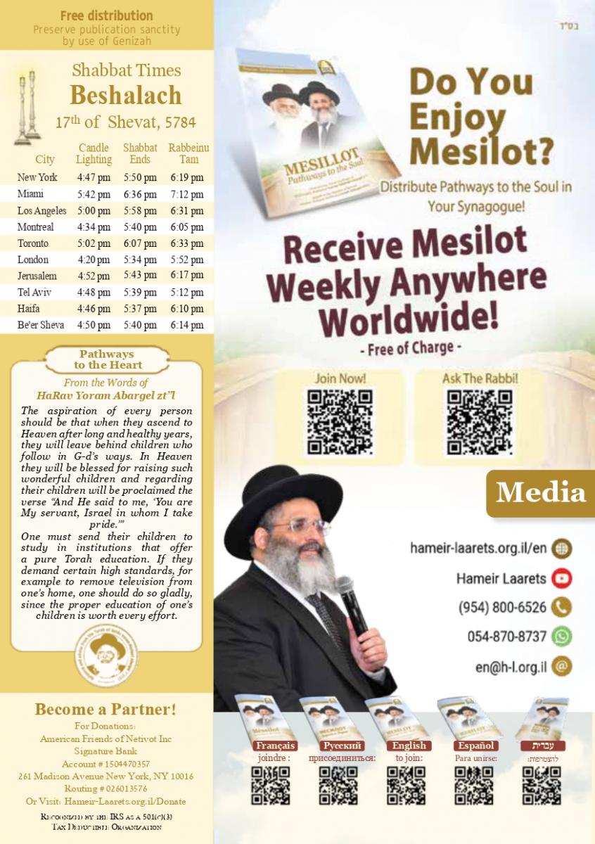 Rabbi Israel Abargel and Hameir Laarets work to spread Torah in Israel and around the world. Their activities include classes, lectures, and daily support and assistance to those in need. Hameir Laarets is a Torah Institute that deals with the publication and distribution of the works and teachings of Rabbi Yoram Michael Abargel zt”l. Hameir Laarets has already released over 50 books and more than 100,000 copies of our publication “Mesillot” are distributed free of charge every week. Our organization also provides daily support and assistance to those in need. Rabbi Yoram Michael Abergel, OB”M was the founder and head of Torah and Hessed institutions called Kol Rina Rav Phelim and Rav Phelim whose center is currently in Netivot . Over 4,000 Avrach scholars study in these institutions. He is the author of: - Bezur Yarom - his lessons on Sefer HaTanya, - Amri Noam - his lessons on the Parshiyot of the week and the festivals of Israel - Kol Rina - prayer arrangement and cycle series