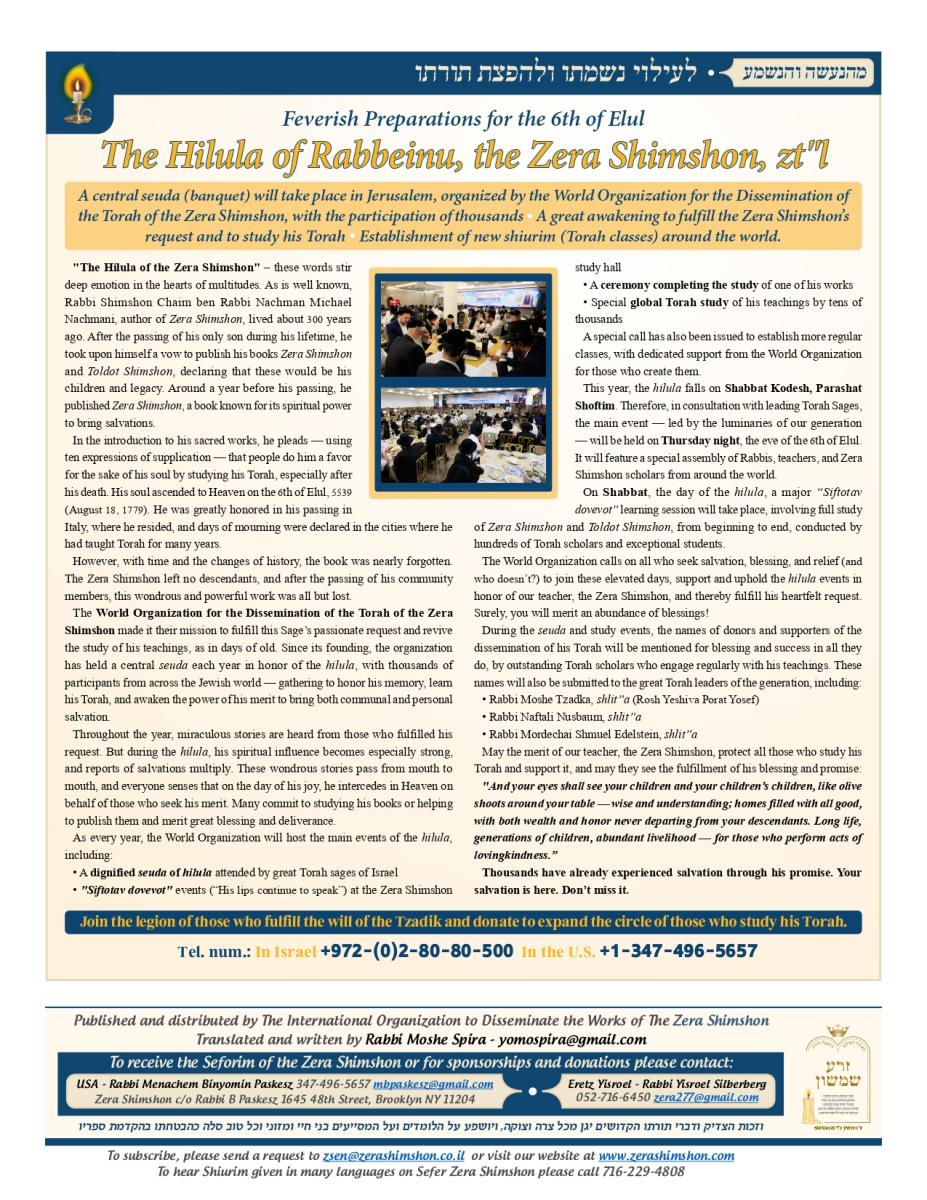 Zera Shimshon - Rabbi Shimshon Chaim ben Rabbi Nachman Michal Nachmani, was a Rabbi of four large communities throughout Italy and in his end of life in the city Reggio Emilia. Rabbi Shimshon Chaim 'Niftar' in the year 1779 in the city Reggio in Itlay. During his funeral, there were many words of praise, not just in his erudition of Torah, but on his love for the Jewish people. The communities in Italy and abroad considered Rabbi Shimshon Chaim their Rebby. Major Rabbis in his generation, wrote amazing things in his honor and wisdom. Including One of the outstanding rabbis figures the 'Hida' (Rabbi Haim Yosef David Azulai ben Rabbi Rephael Yitzhak Zerachia) had testify on Rabbi Shimshon Chaim praise in 'Kedushah' and wisdom and also knowledge in studying 'Kabala' and practical 'Kabala'. Rabbi Shimshon Chaim lived in 'Or ha-Ḥayyim' 'Hakadosh' (Rabbi Chaim ben Atar ben Rabbi Moshe) era, and was in friendship with him. Rabbi Shimshon Chaim had only one child, a son, who died at a young age. Upon this Rabbi Shimshon Chaim decided to dedicate his 'Sefarim' to the memory of this child who had no continuity of a family. In the beginning of his book Rabbi Shimshon Chaim wrote that he need to leave some memory in this world because he has no continuity. And that’s why he wrote the book and named it: "Zera Shimshon", means the Seed of Shimshon. Rabbi Shimshon Chaim publish the book one year before he died. Rabbi Shimshon Chaim placed a lot of his energy, during his lifetime that people should learn from his ''Sefarim''. Rabbi Shimshon Chaim also emphasized, that after his 'Neshama', will leave this world that people should continue to learn from his ''Sefarim''. What is most unusual for a Tzadik of this stature, was that he made a promise. That promise is that anyone that takes upon himself to learn from his writing, he promises "children, praise, health, 'Parnasa', wealth, honor".