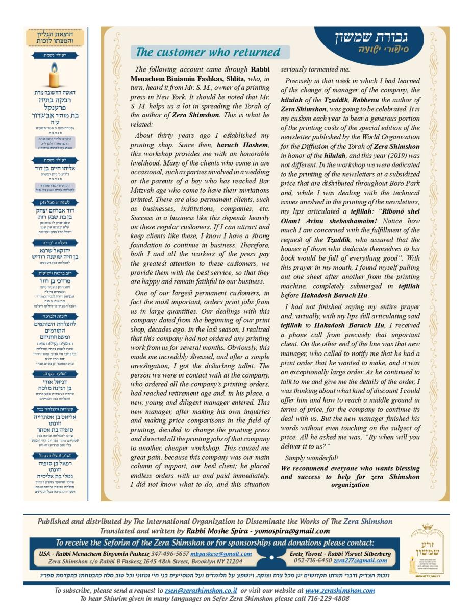 Zera Shimshon - Rabbi Shimshon Chaim ben Rabbi Nachman Michal Nachmani, was a Rabbi of four large communities throughout Italy and in his end of life in the city Reggio Emilia. Rabbi Shimshon Chaim 'Niftar' in the year 1779 in the city Reggio in Itlay. During his funeral, there were many words of praise, not just in his erudition of Torah, but on his love for the Jewish people. The communities in Italy and abroad considered Rabbi Shimshon Chaim their Rebby. Major Rabbis in his generation, wrote amazing things in his honor and wisdom. Including One of the outstanding rabbis figures the 'Hida' (Rabbi Haim Yosef David Azulai ben Rabbi Rephael Yitzhak Zerachia) had testify on Rabbi Shimshon Chaim praise in 'Kedushah' and wisdom and also knowledge in studying 'Kabala' and practical 'Kabala'. Rabbi Shimshon Chaim lived in 'Or ha-Ḥayyim' 'Hakadosh' (Rabbi Chaim ben Atar ben Rabbi Moshe) era, and was in friendship with him. Rabbi Shimshon Chaim had only one child, a son, who died at a young age. Upon this Rabbi Shimshon Chaim decided to dedicate his 'Sefarim' to the memory of this child who had no continuity of a family. In the beginning of his book Rabbi Shimshon Chaim wrote that he need to leave some memory in this world because he has no continuity. And that’s why he wrote the book and named it: "Zera Shimshon", means the Seed of Shimshon. Rabbi Shimshon Chaim publish the book one year before he died. Rabbi Shimshon Chaim placed a lot of his energy, during his lifetime that people should learn from his ''Sefarim''. Rabbi Shimshon Chaim also emphasized, that after his 'Neshama', will leave this world that people should continue to learn from his ''Sefarim''. What is most unusual for a Tzadik of this stature, was that he made a promise. That promise is that anyone that takes upon himself to learn from his writing, he promises "children, praise, health, 'Parnasa', wealth, honor".