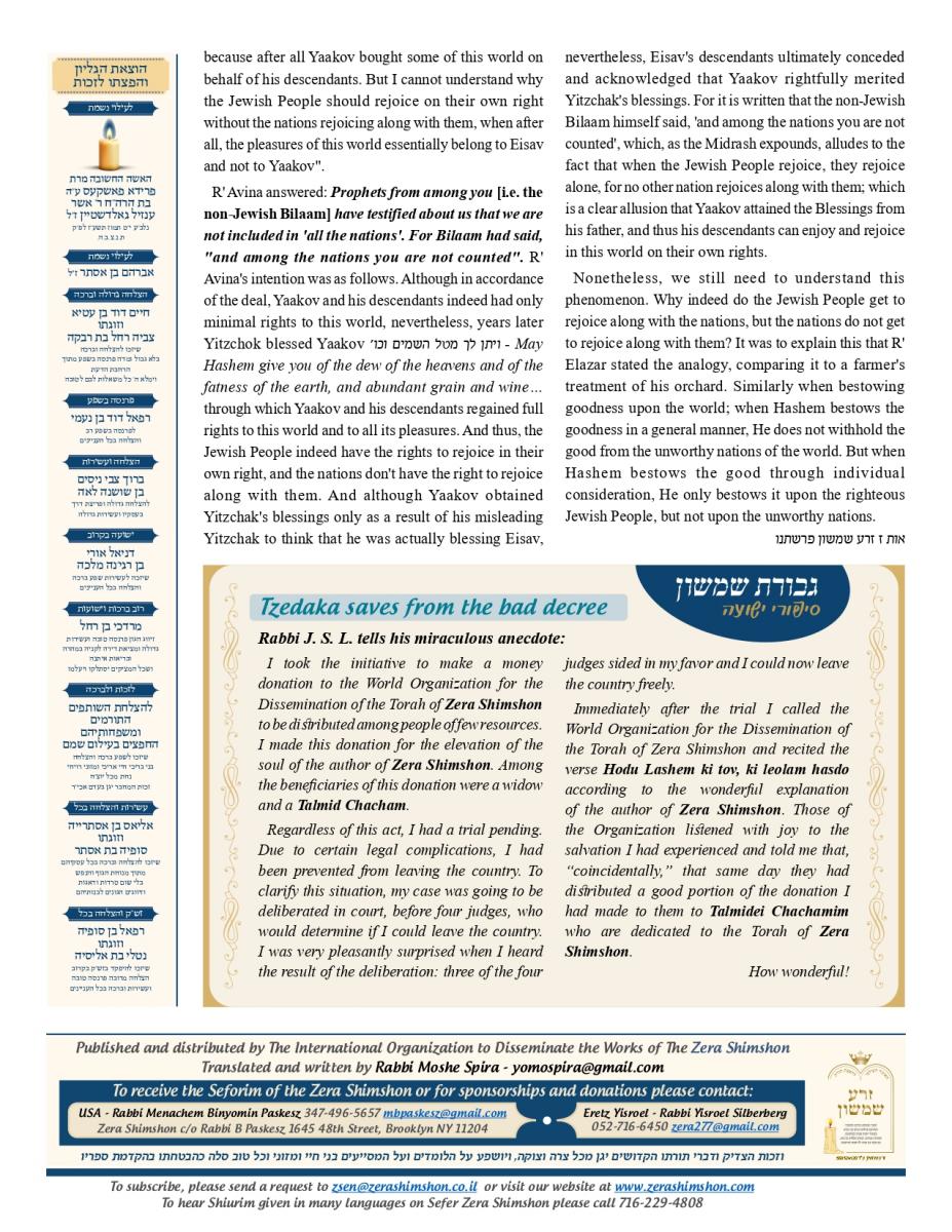 Zera Shimshon - Rabbi Shimshon Chaim ben Rabbi Nachman Michal Nachmani, was a Rabbi of four large communities throughout Italy and in his end of life in the city Reggio Emilia. Rabbi Shimshon Chaim 'Niftar' in the year 1779 in the city Reggio in Itlay. During his funeral, there were many words of praise, not just in his erudition of Torah, but on his love for the Jewish people. The communities in Italy and abroad considered Rabbi Shimshon Chaim their Rebby. Major Rabbis in his generation, wrote amazing things in his honor and wisdom. Including One of the outstanding rabbis figures the 'Hida' (Rabbi Haim Yosef David Azulai ben Rabbi Rephael Yitzhak Zerachia) had testify on Rabbi Shimshon Chaim praise in 'Kedushah' and wisdom and also knowledge in studying 'Kabala' and practical 'Kabala'. Rabbi Shimshon Chaim lived in 'Or ha-Ḥayyim' 'Hakadosh' (Rabbi Chaim ben Atar ben Rabbi Moshe) era, and was in friendship with him. Rabbi Shimshon Chaim had only one child, a son, who died at a young age. Upon this Rabbi Shimshon Chaim decided to dedicate his 'Sefarim' to the memory of this child who had no continuity of a family. In the beginning of his book Rabbi Shimshon Chaim wrote that he need to leave some memory in this world because he has no continuity. And that’s why he wrote the book and named it: "Zera Shimshon", means the Seed of Shimshon. Rabbi Shimshon Chaim publish the book one year before he died. Rabbi Shimshon Chaim placed a lot of his energy, during his lifetime that people should learn from his ''Sefarim''. Rabbi Shimshon Chaim also emphasized, that after his 'Neshama', will leave this world that people should continue to learn from his ''Sefarim''. What is most unusual for a Tzadik of this stature, was that he made a promise. That promise is that anyone that takes upon himself to learn from his writing, he promises "children, praise, health, 'Parnasa', wealth, honor".