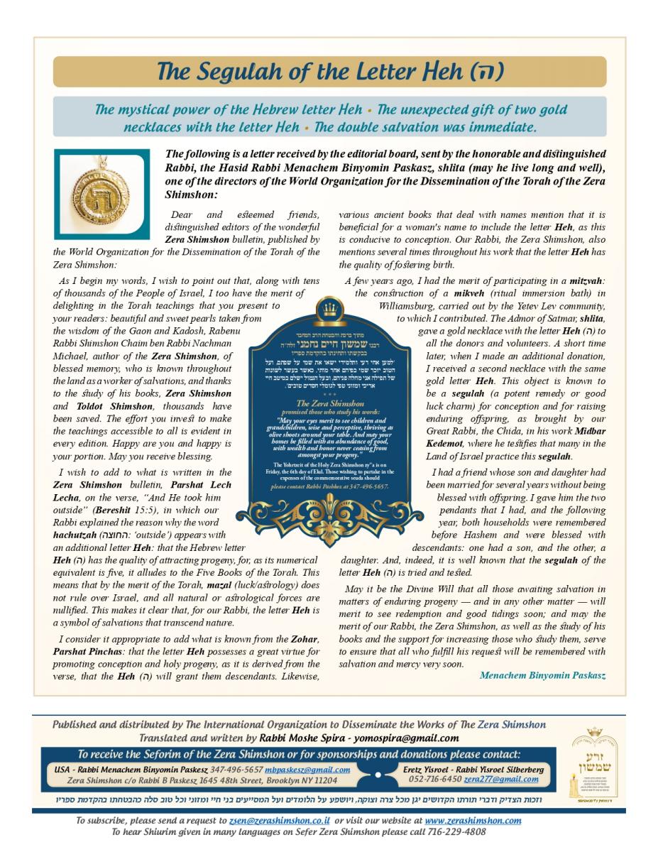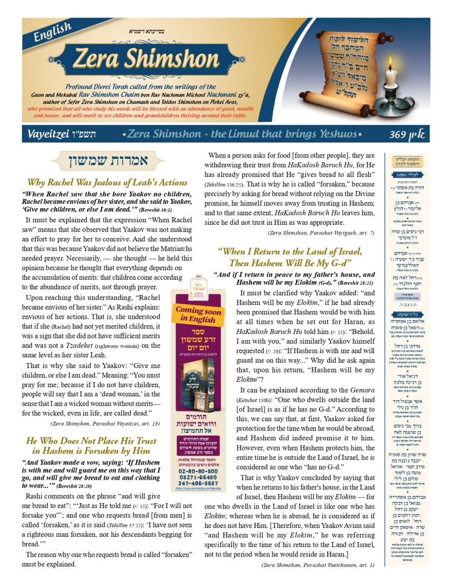 Zera Shimshon - Rabbi Shimshon Chaim ben Rabbi Nachman Michal Nachmani, was a Rabbi of four large communities throughout Italy and in his end of life in the city Reggio Emilia. Rabbi Shimshon Chaim 'Niftar' in the year 1779 in the city Reggio in Itlay. During his funeral, there were many words of praise, not just in his erudition of Torah, but on his love for the Jewish people. The communities in Italy and abroad considered Rabbi Shimshon Chaim their Rebby. Major Rabbis in his generation, wrote amazing things in his honor and wisdom. Including One of the outstanding rabbis figures the 'Hida' (Rabbi Haim Yosef David Azulai ben Rabbi Rephael Yitzhak Zerachia) had testify on Rabbi Shimshon Chaim praise in 'Kedushah' and wisdom and also knowledge in studying 'Kabala' and practical 'Kabala'. Rabbi Shimshon Chaim lived in 'Or ha-Ḥayyim' 'Hakadosh' (Rabbi Chaim ben Atar ben Rabbi Moshe) era, and was in friendship with him. Rabbi Shimshon Chaim had only one child, a son, who died at a young age. Upon this Rabbi Shimshon Chaim decided to dedicate his 'Sefarim' to the memory of this child who had no continuity of a family. In the beginning of his book Rabbi Shimshon Chaim wrote that he need to leave some memory in this world because he has no continuity. And that’s why he wrote the book and named it: "Zera Shimshon", means the Seed of Shimshon. Rabbi Shimshon Chaim publish the book one year before he died. Rabbi Shimshon Chaim placed a lot of his energy, during his lifetime that people should learn from his ''Sefarim''. Rabbi Shimshon Chaim also emphasized, that after his 'Neshama', will leave this world that people should continue to learn from his ''Sefarim''. What is most unusual for a Tzadik of this stature, was that he made a promise. That promise is that anyone that takes upon himself to learn from his writing, he promises "children, praise, health, 'Parnasa', wealth, honor".